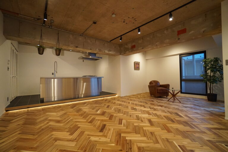 キッチンのデザイン性をアップしたり、躯体現しの天井を施したり、ヘリンボーン床に変更した例です。
