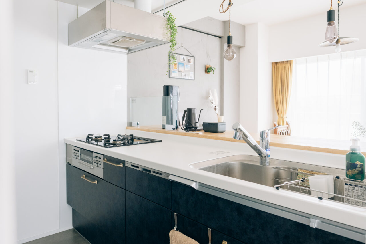 Panasonic社のシステムキッチンを採用させてもらい、色はブラック系で締まる色に。