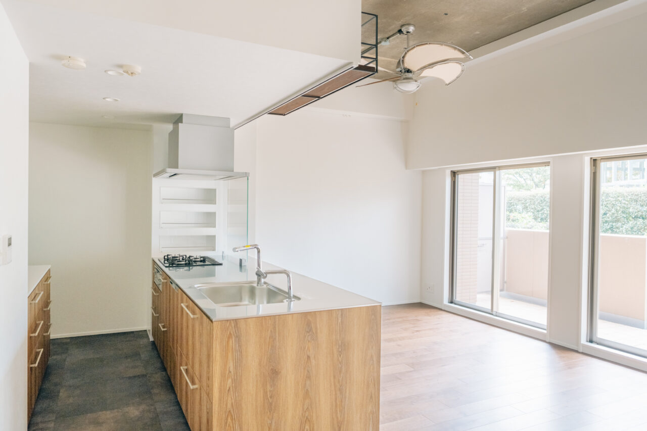 約95平米の広さを活かし、大きなシステムキッチンを導入。